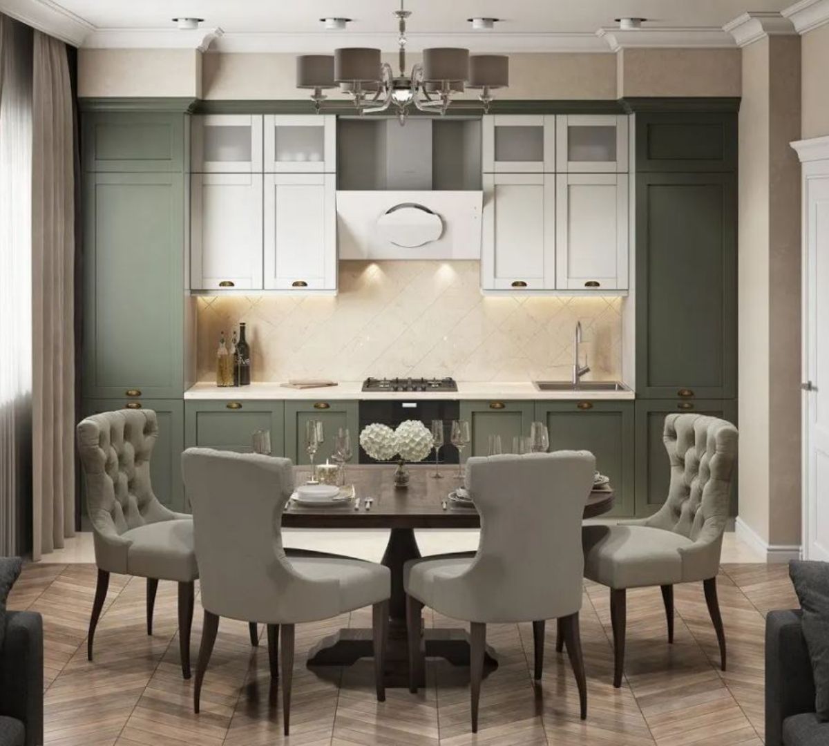 - Классика. Как правило, представляет собой сочетание природных материалов: камень, дерево, дорогой текстиль. Чтобы современная техника вписывалась в интерьер классической кухни, ее прячут за дверцами мебели;