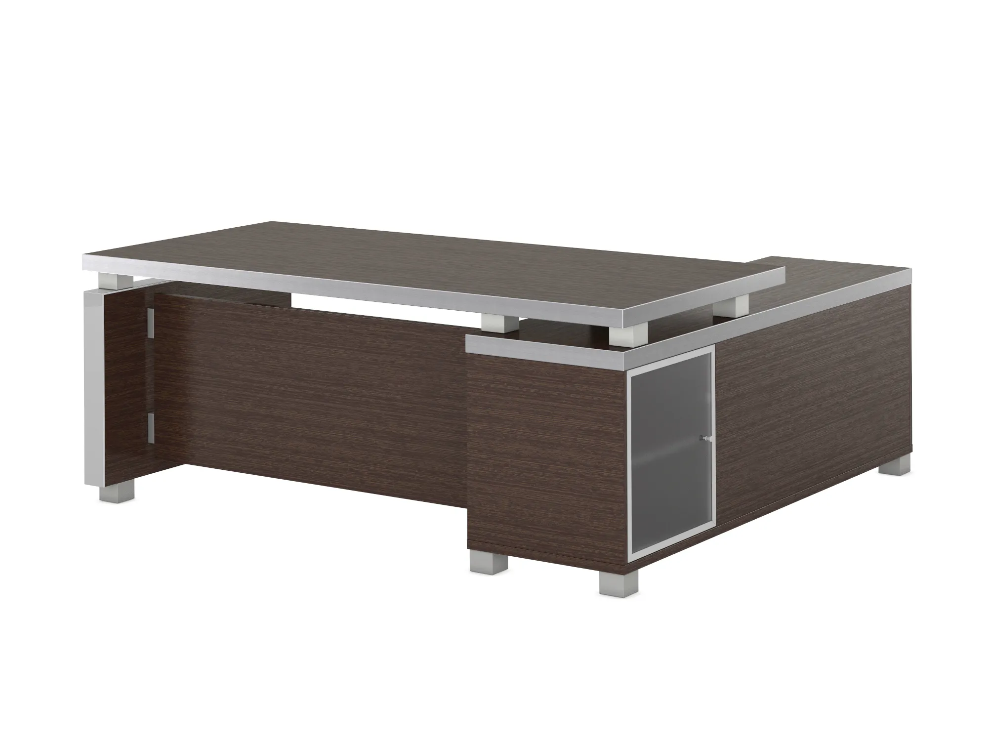 Кабинет директора EDVARD - это стол с массивной столешницей и такими же топами шкафов и тумб (толщина 50 мм), приставные и мобильные тумбы, греденции и стеллажи к ним, шкафы. В этой мебели используется кромка 3D acryl цвета серебристый металлик, она подчеркивает чёткость линий, придает кабинету своеобразие и неповторимый стиль. В модельном ряду есть композиции со светильниками, вмонтированными в топы.