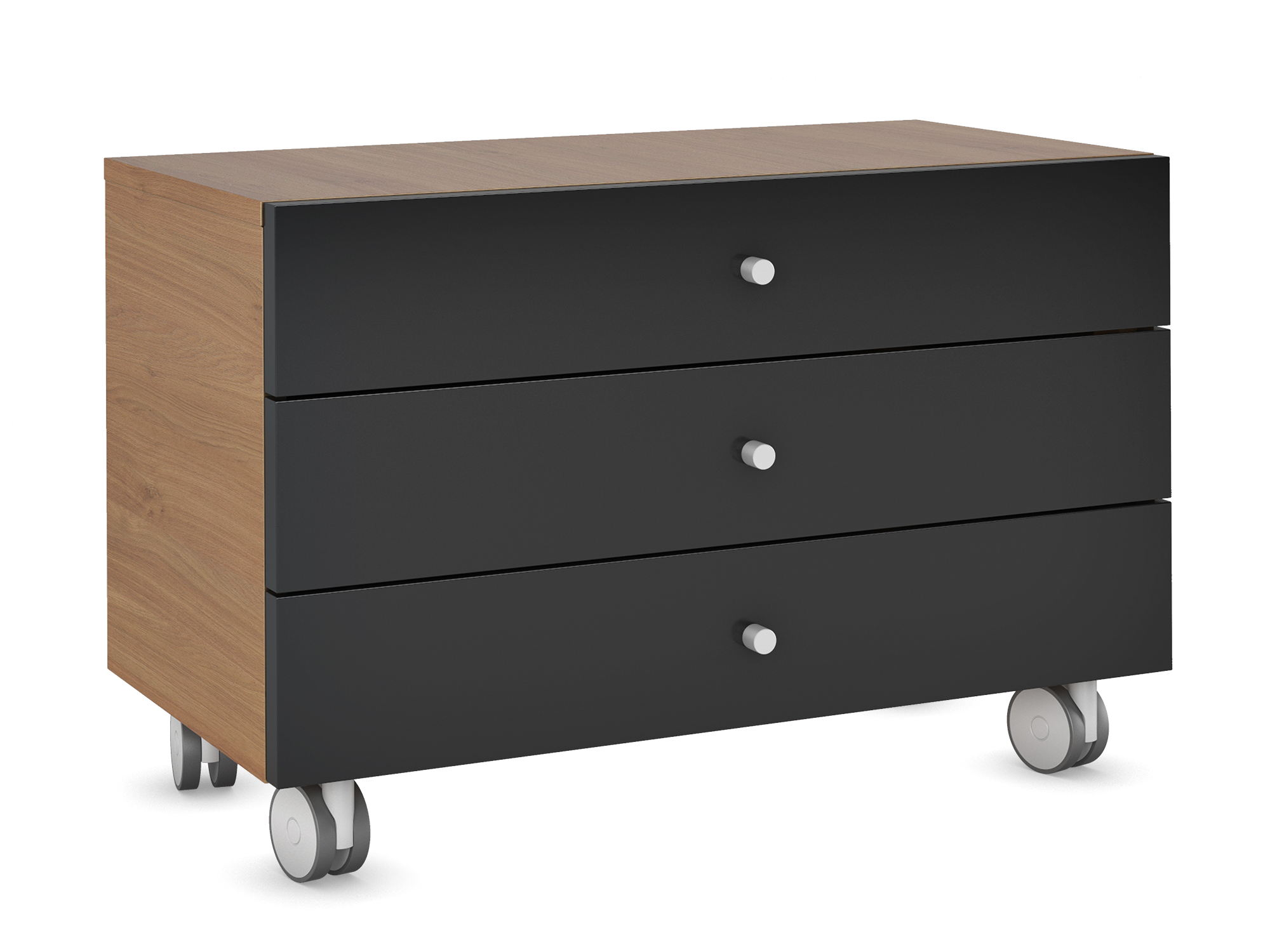 Фасады ящиков: цвет белый глянец, материал – ламинированная МДФ 18 мм. PerfectSense Premium Gloss (EGGER) Каркас: материал – ЛДСП 18 мм. Цвет: «Дуб Честерфилд». Кромка каркаса тумбы PVC 0,4 мм в цвет. Задняя стенка тумбы: материал – ЛДСП 18 мм, в цв. каркаса. Ящики – метабоксы с доводчиками. Дно ящика и задняя стенка ящика – ЛДСП 16 мм, белого цвета. Стенки ящика – металл. Колесные опоры: D50 мм. Ручки-кнопки: металлические, никель, D 20мм. Замки отсутствуют.