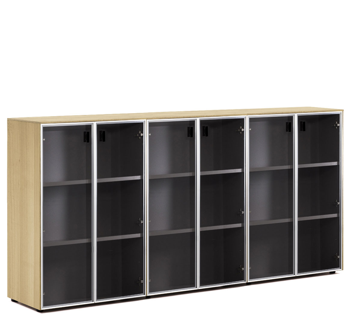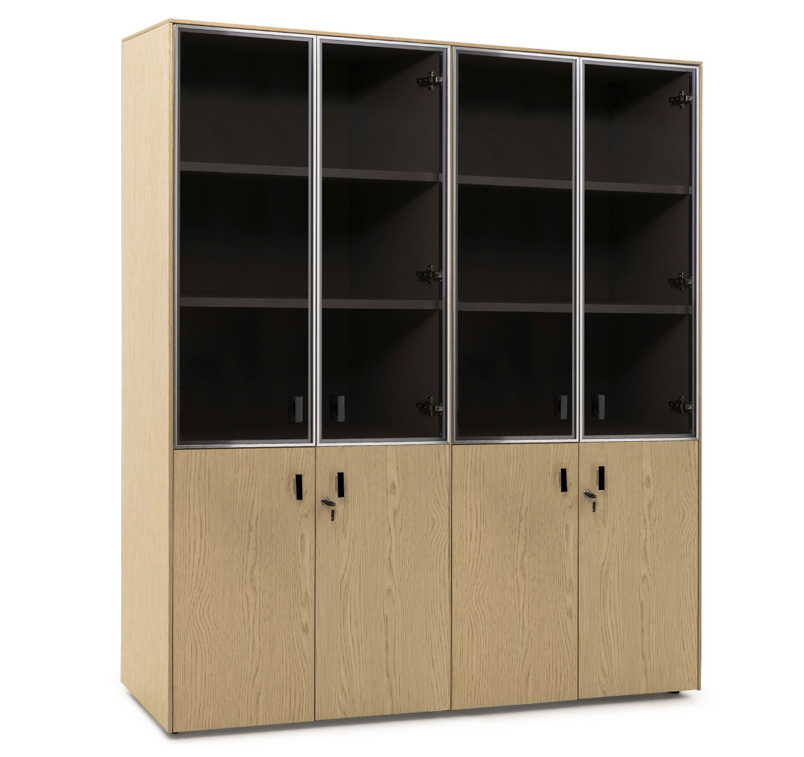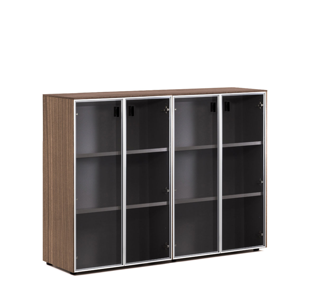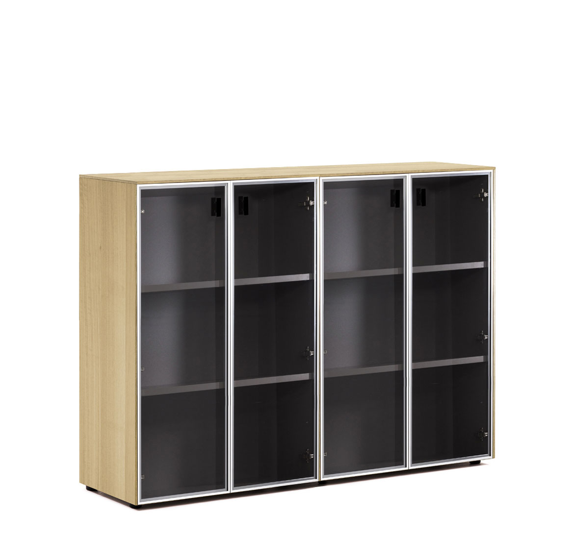 Шкафы: Каркас и полки — меламин. Боковые панели, топ и деревянные двери — шпон. Стеклянные двери в металлическом профиле из полированного алюминия. Фасады дверей укомплектованы ручками под цвет металлических опор письменных столов — хромированные или черные (порошковая покраска).