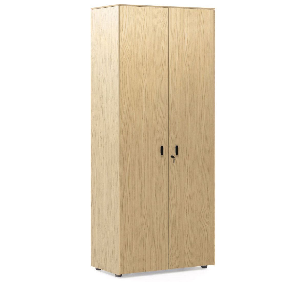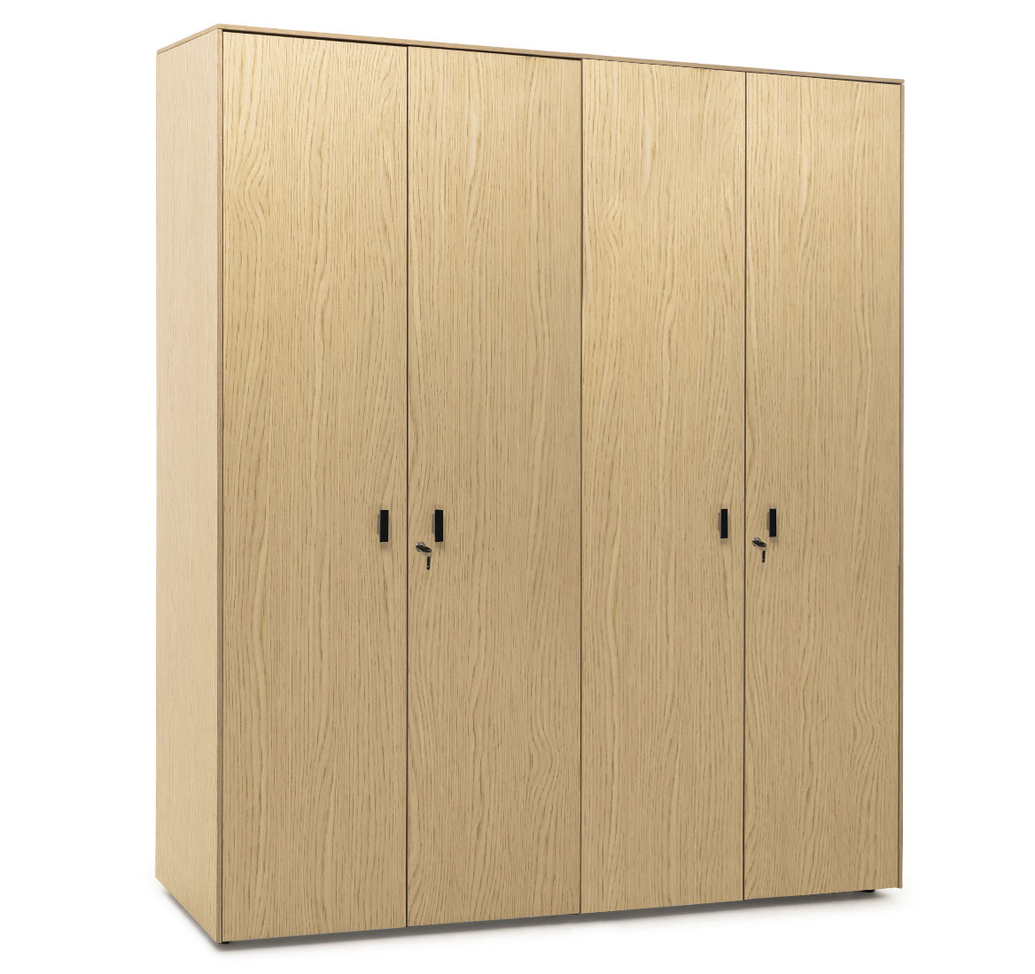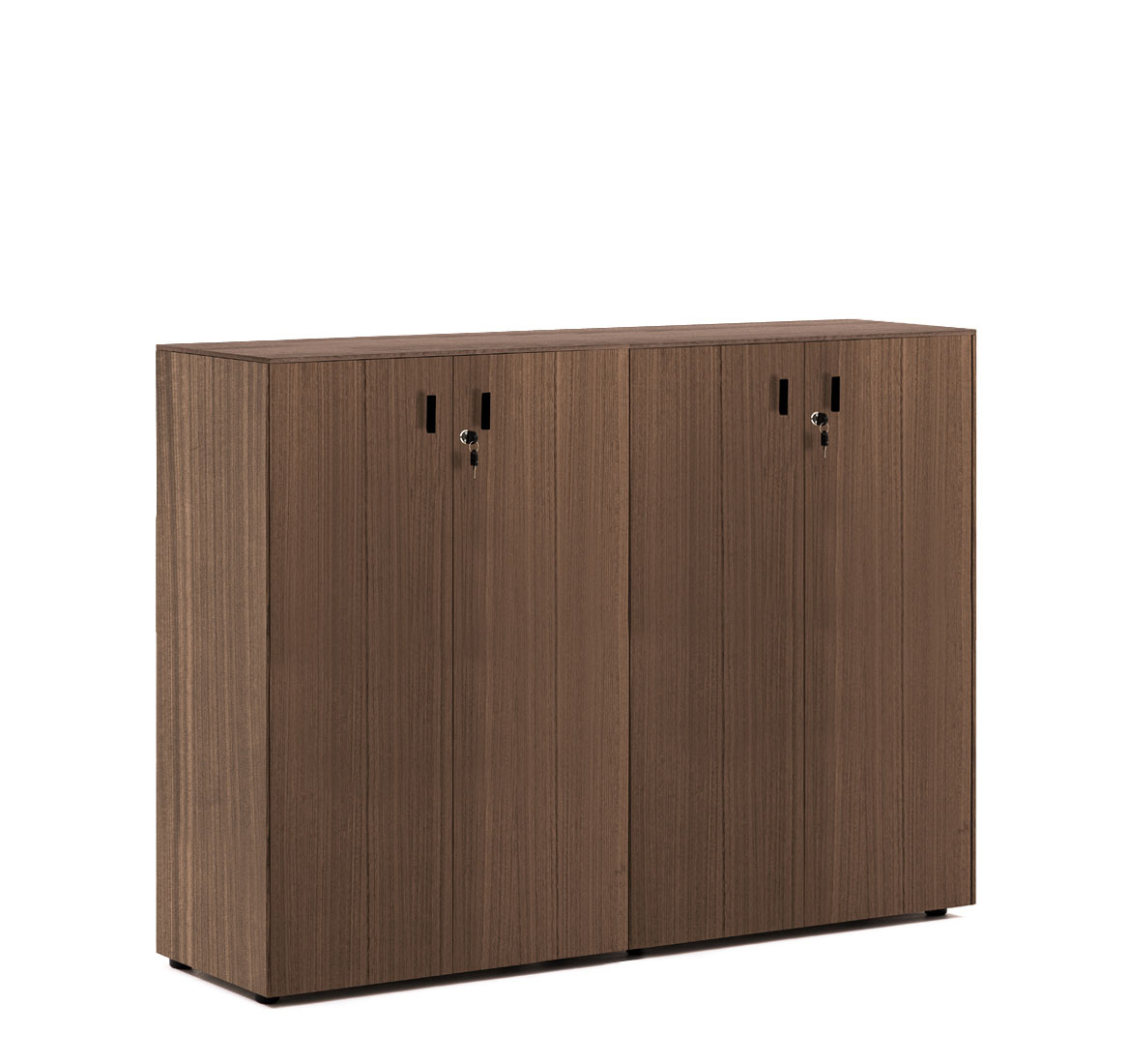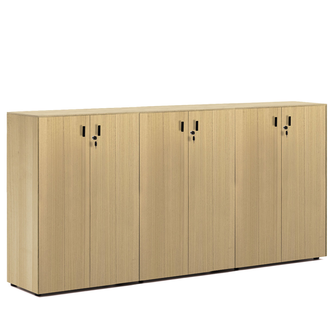 Шкафы: Каркас и полки — меламин. Боковые панели, топ и деревянные двери — шпон. Стеклянные двери в металлическом профиле из полированного алюминия. Фасады дверей укомплектованы ручками под цвет металлических опор письменных столов — хромированные или черные (порошковая покраска).