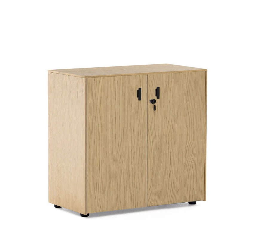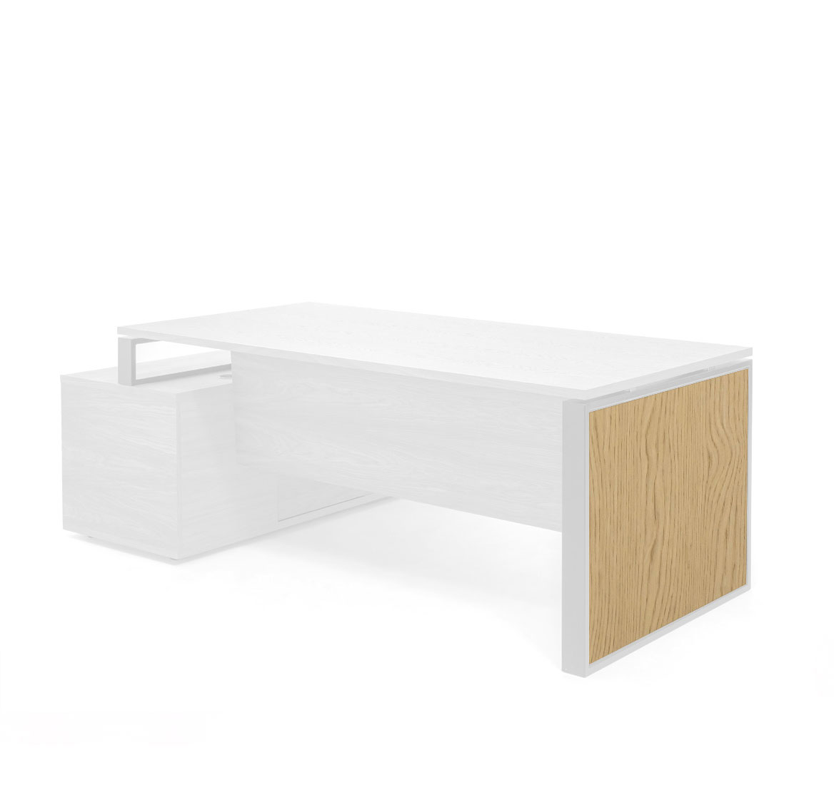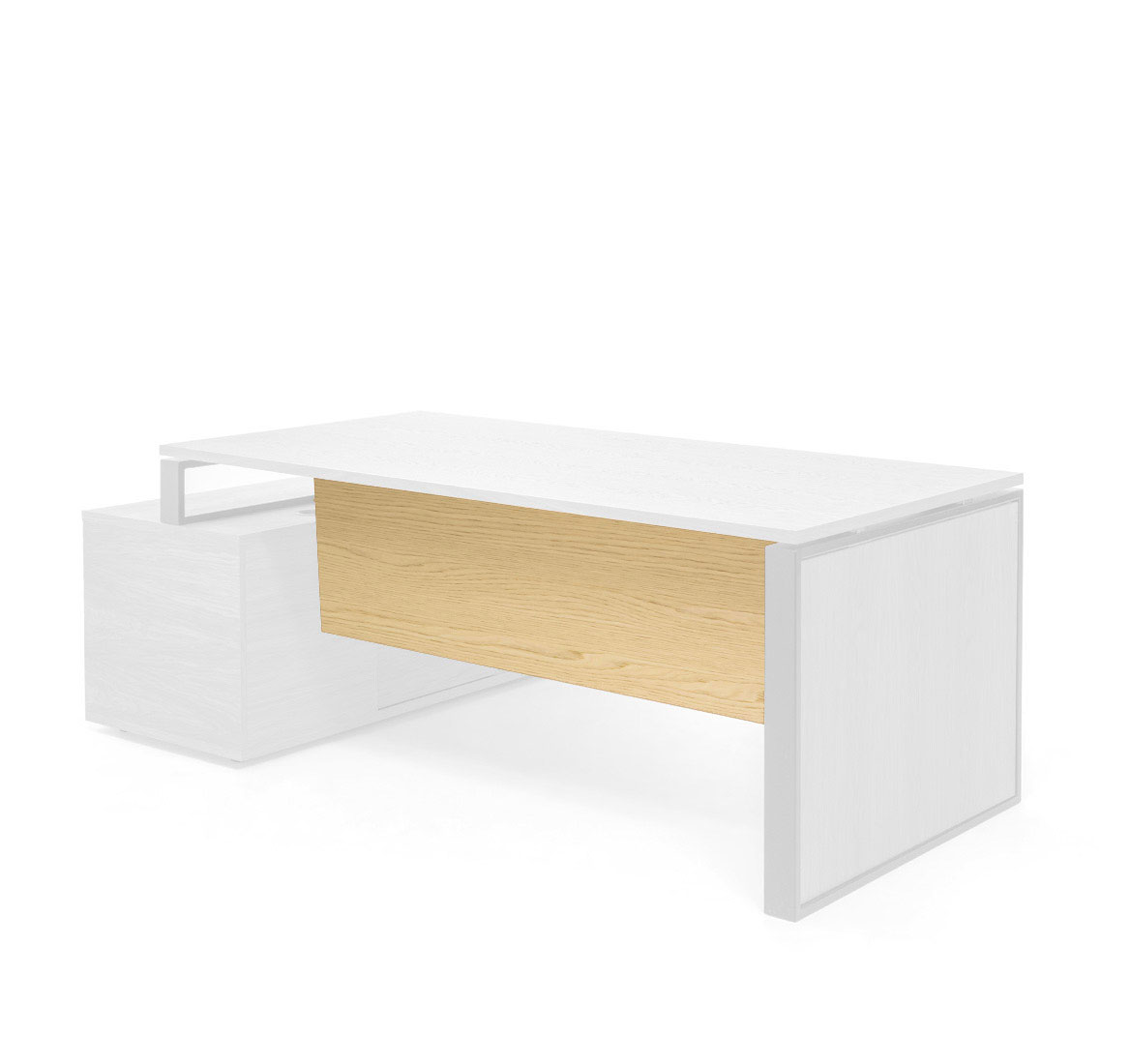 Тумбы: Каркас — меламин. Боковые панели, топ, задняя стенка, фасады выдвижных ящиков и дверей — шпон. Выдвижные ящики — металлические. Фасады ящиков и дверей укомплектованы ручками под цвет металлических опор письменных столов — хромированные или черные (порошковая покраска). Система плавного закрывания дверей и ящиков от Hettich.
