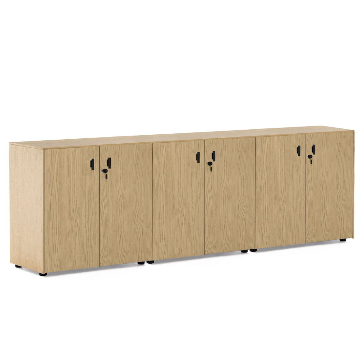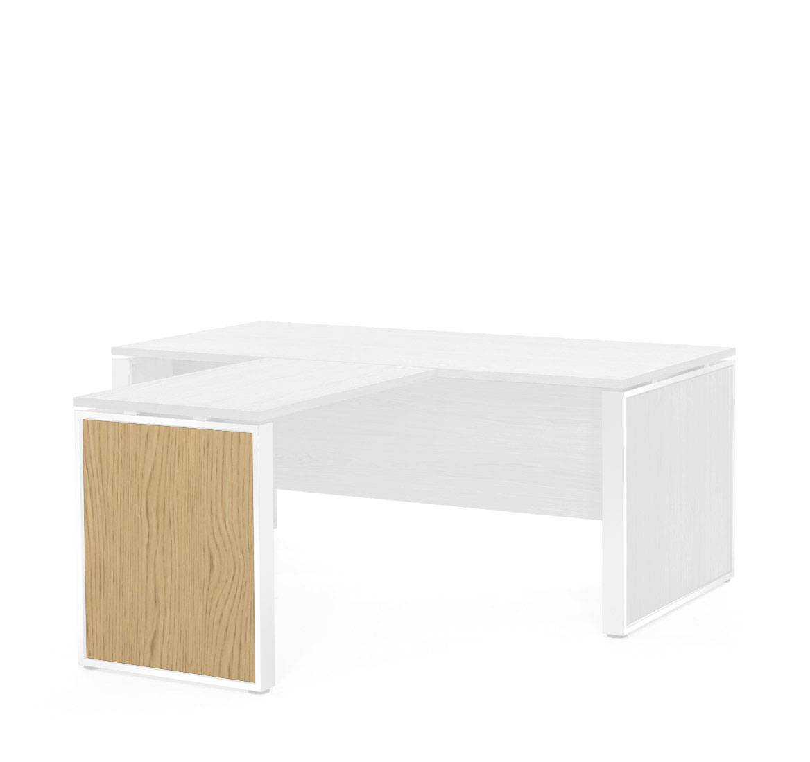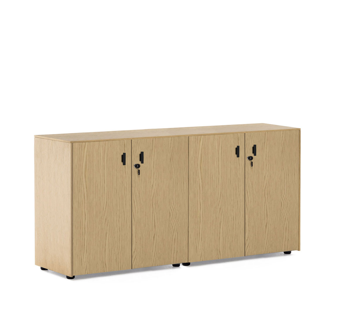 Тумбы: Каркас — меламин. Боковые панели, топ, задняя стенка, фасады выдвижных ящиков и дверей — шпон. Выдвижные ящики — металлические. Фасады ящиков и дверей укомплектованы ручками под цвет металлических опор письменных столов — хромированные или черные (порошковая покраска). Система плавного закрывания дверей и ящиков от Hettich.