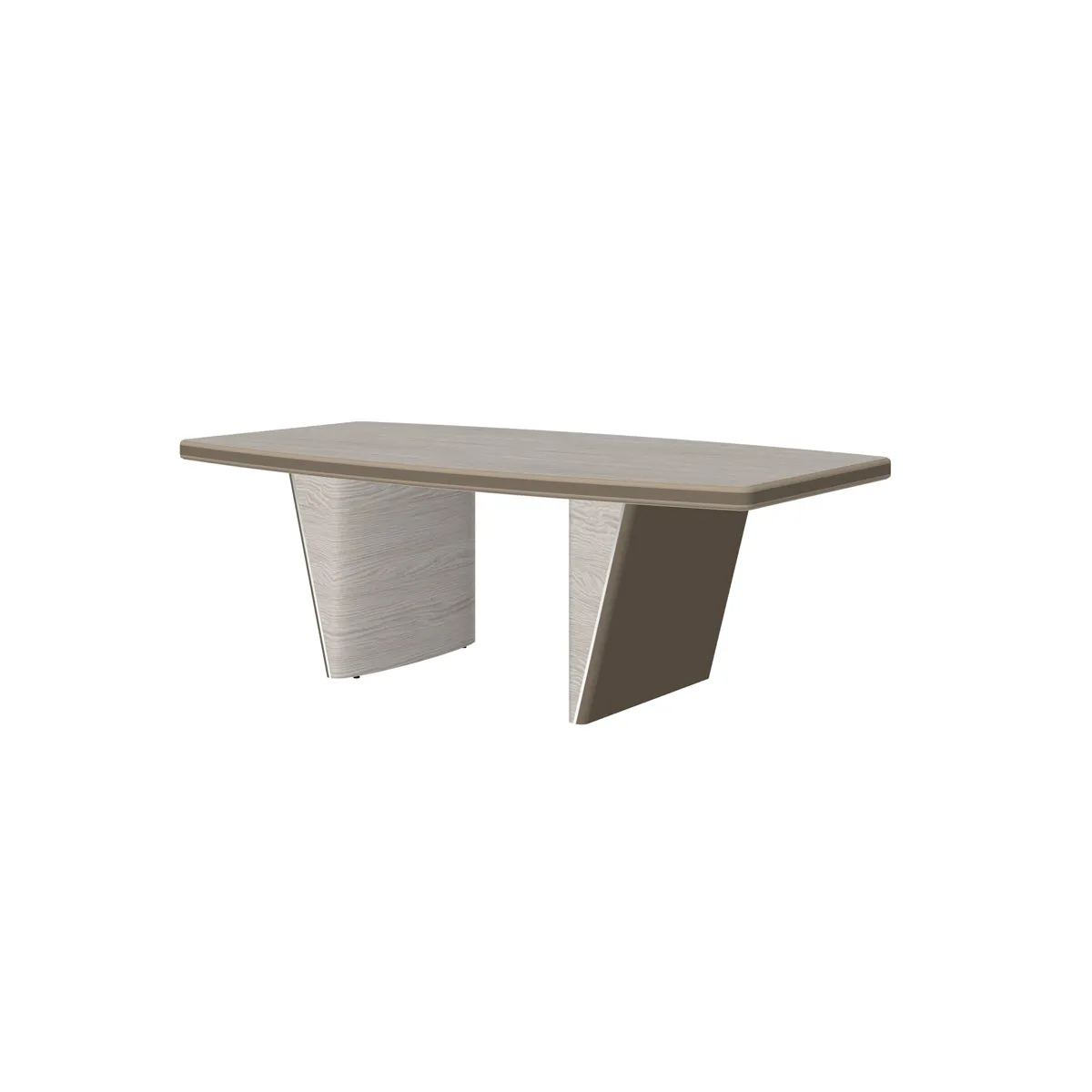 - Столешницы столов, боковых приставок и брифингов по торцу декорированы вставками из экокожи. Опоры выполнены в виде объемных коробов треугольной формы с наклонной съемной панелью, обтянутой экокожей. Грани между боковой и лицевой поверхностями коробов скруглены. Опоры декорированы металлическим молдингом с покрытием «хром глянцевый».